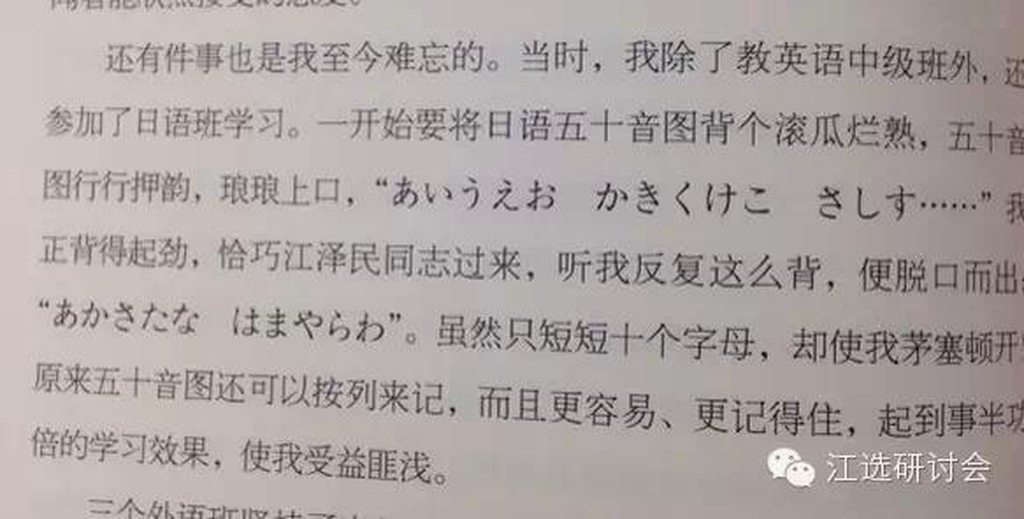江没说谎,后来五十年代在上海工作时,单位成立了日语学习班,江也报名参加了。刚在日语班时,一同事跟他开玩笑说江的名字日语发音应该叫Kezagumin(译音),江说不对吧,应该念Koutakumin(译音),后来这位同事去查,果然江是对的。